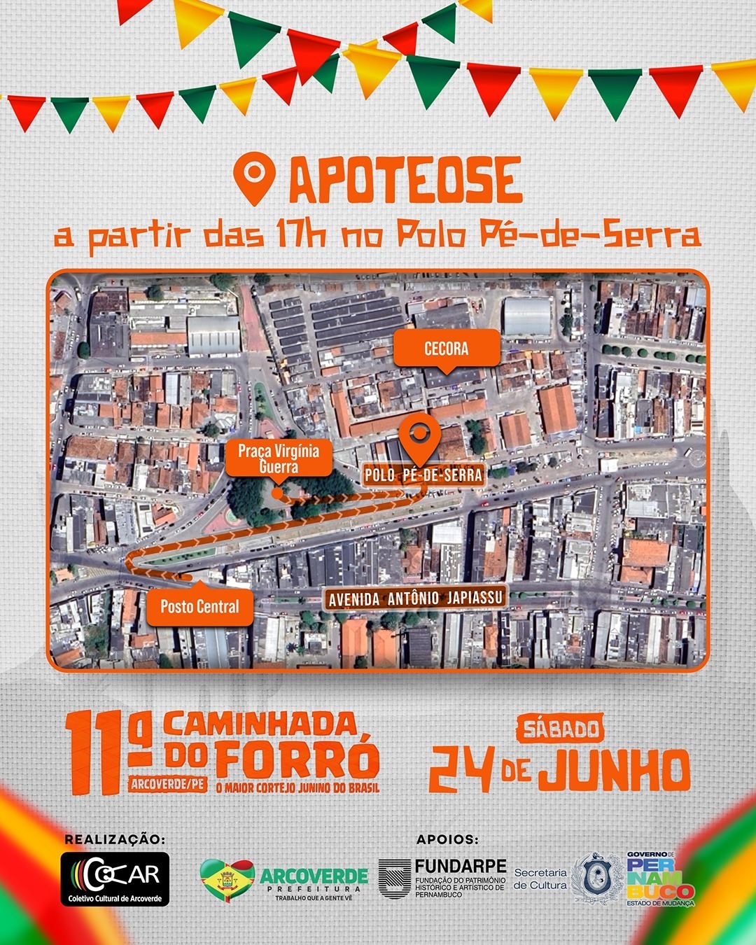 Desse ponto, haverá um arrastão cruzando a Praça Winston Siqueira (Virgínia Guerra) até chegar no palco da Apoteose, localizado no Largo do CECORA, onde ocorrerão os shows de encerramento da Caminhada do Forró.