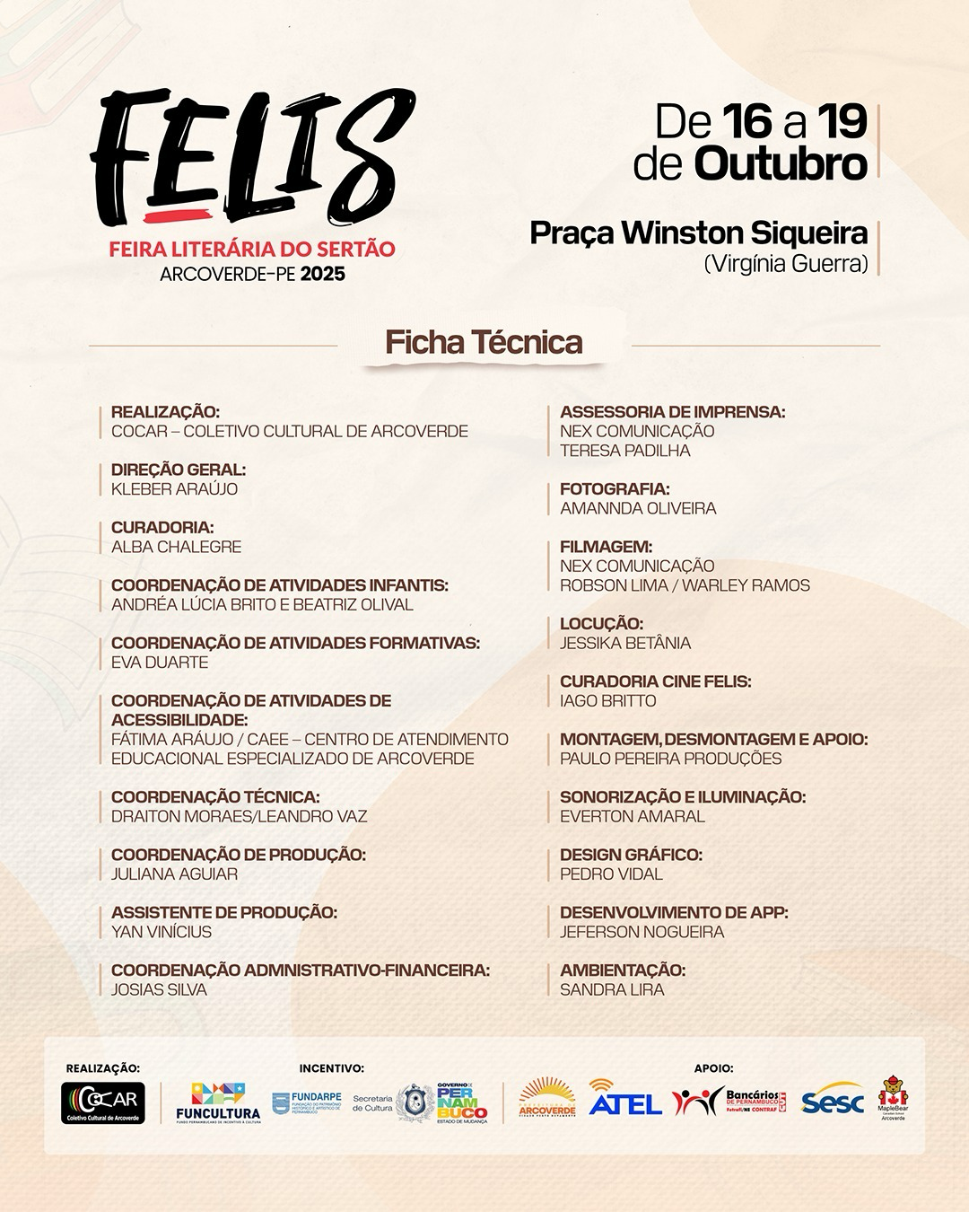 A 7ª edição da FELIS – Feira Literária do Sertão, realizada de 16 a 19 de outubro de 2025, na cidade de Arcoverde, reafirmou seu papel como um dos mais importantes eventos literários do interior de Pernambuco. Com a realização do Coletivo Cultural de Arcoverde – COCAR e incentivo do Funcultura, Fundarpe, Secretaria de Cultura do Estado e Governo de Pernambuco, a Feira atraiu uma média de mil visitantes por dia à Praça Winston Siqueira, movimentando a cidade das 15h às 22h.